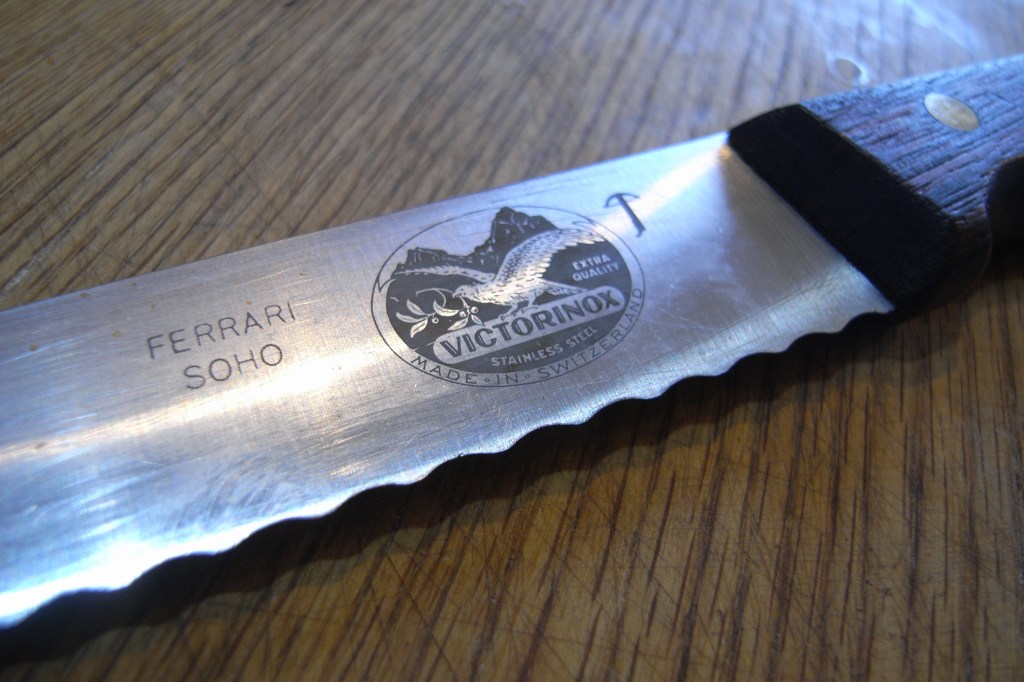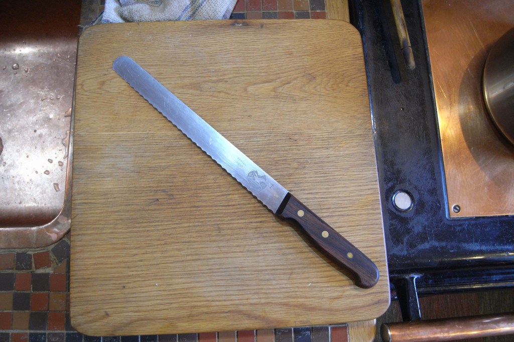 So we went out, I can’t remember who bought it, but very swiftly was purchased the most expensive knife on the market and so it always had a certain angst about it because it was associated with cutting thumbs. When Jacqueline Du Pre left, she just walked out and left everything behind….. she then very soon met Daniel Barenboim, and they became very well known. I know who bought it – it was one of her ardent admirers – a Canadian pianist called Guthrie Luke who adored Jacqueline. There were two young pianists in our life at that time, who were the last two pupils of a famous French pianist called Cortot and these chaps were his last pupils and they both adored Jackie but Guthrie absolutely worshipped Jackie, from a distance of course. Guthrie Luke was responsible for purchasing this knife – he was a rich young man, he could have afforded an expensive bread knife. But she had no interest in materials affairs so she left it behind, with a careless backward glance, and so I have inherited this terrific breadknife, and we are talking about 1962, and it has never been sharpened.