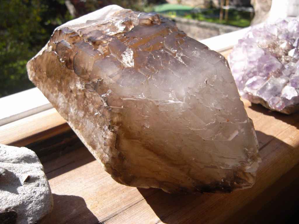 This is a very very noble smokey quartz, and I discovered when I was handling it that it has embedded in it some little cairngorms, and it has been robbed of other cairngorms I see when I look at it closely. They and the things that go in Scottish Skean Dhus. That hexagon there, and there’s another half buried one there. I thought we’d have a chat about it because it is a beautiful example of a piece of crystal structure embedded with many many forms. The forms of the uprights are all rectangular or square, and if you were to draw out the shapes on them it would make a very interesting picture. And some of them are to me extremely like the old gnomes and trolls in stories in mountains. I think this is a five faced crystal, and the slopey tops are all like mountain ranges. So it’s really great fun to take the object in your hand and let the light play on it and see how clever the geometry is.