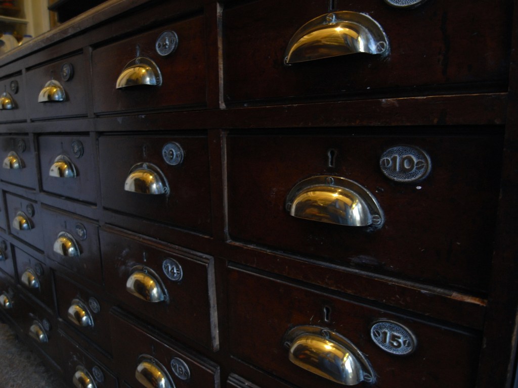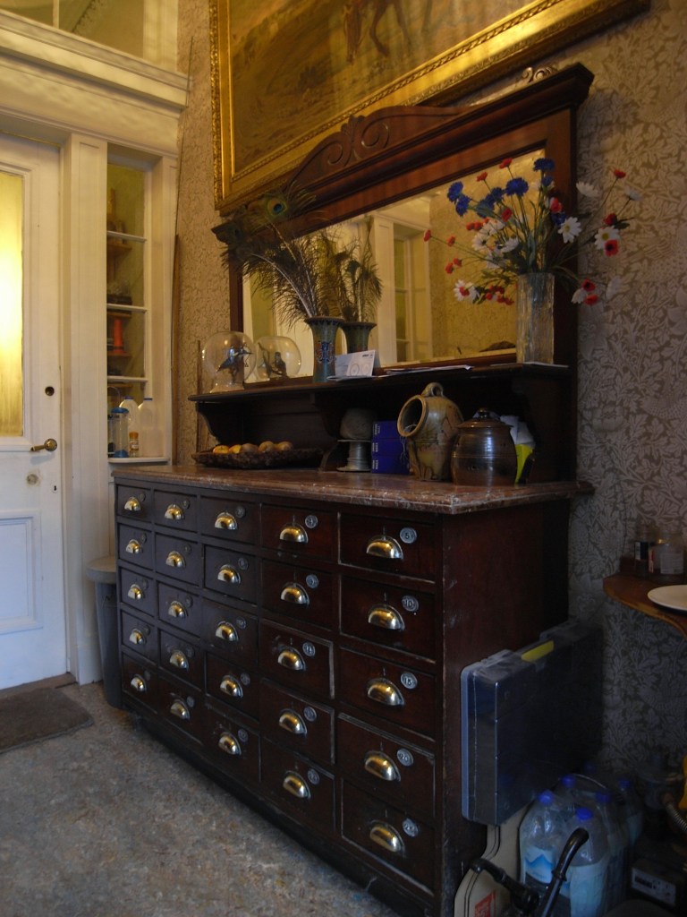 It seemed so attractive and I thought it was a very good basement bit of furniture – not precious but with all those drawers very useful. It had come from the Hull Merchant Navy club where it was used in their sports department with members coming in because Hull was a very strong merchant navy. The port of Hull was very busy, a lot of trade with Europe. When people came in to change they would get a ticket with a number on the drawer and put their clothes in there and take out their gymshoes and singlets and so on for their sports, so clearly there were at least 30 members of the sports club, and that is really it. It’s not an old family piece or anything of that sort, but ideal for family life with drawers, but I don’t really remember it being used for family. Mum had some drawers, I had the end 4 drawers for gardening things, but the marble top was very useful for dropping things between bedrooms and bathrooms and gardens and upstairs and downstairs and so on.