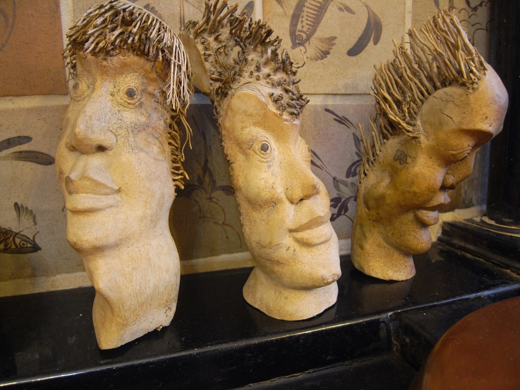 Alison – These remarkable faces came out of the eurasian crafts antique shop in the Great Western Road a long time ago, where someones father did a lot of travelling and got a lot of remarkable objects for the shop. I acquired them a long time ago because I was absolutely fascinated at the way they made use of the root hairs to make hair, and I also loved the soft plasticity of the nose and the mouth. I don’t actually know what the native people actually look like from the area round Bali. These are supposedly from the little island of Sumba [Antony says – well in fact they come from the whole of the Far East – China, Vietnam, Thailand, Indonesia. Indonesia would have been the main importer, and probably because of the holiday connection, Bali in particular]