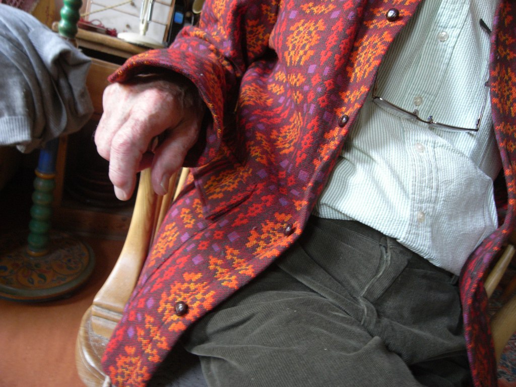 She converted me. Mark you I came under regular pressure and I had to , I couldn’t live a totally separate life. My life was separate enough going into the office each day. And anyway later on came the jackets, and I think the first one she bought some material of that blue jacket, wooly, very loose and roomy, side pockets and we had it made up by two tailors I used. One was a tailor I had always used in Maryhill Road, Mr O’Docherty, and then when he gave up, his son moved to great western road and I went to the standard tailor in Milngavie. Each of those made up these garments and again I used to wear them with a polo neck at the office. Probably more winter. This shirt is quite cool and so the blue one was my favourite because it was very loose and comfortable. [the blue version of that which is dead now, says Mil] and so I would then wear this red one, and this I think mum actually bought for me as a jacket in Wales. Wallace Woollen Mill West Wales. It can’t have been as early as that time we had the holiday in Aberystwyth when Ben ate ice cream with chocolate everywhere on the shore. Totally covered in chocolate. It must have been another occasion because we often went to Wales because of her connections in north Wales and bought this as a jacket. I never liked it so much. It was stiffer and very warm and in the office with heating I often took it off and so had no pockets. So if I wasn’t carrying my leather bag and didn’t have this with pockets I was stuck.